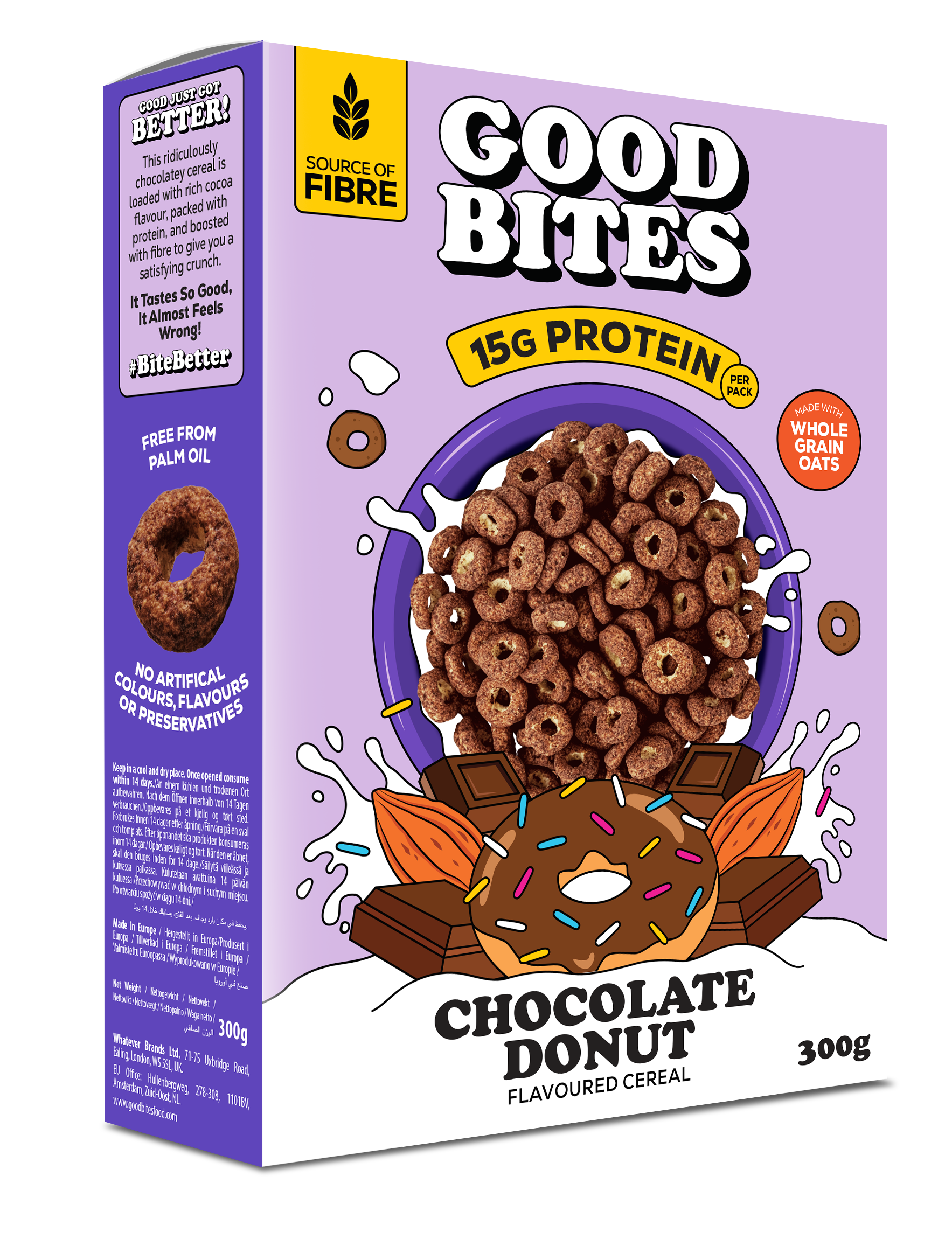Good Bites Chocolate Donut Cereal is a tasty and nutritious cereal made with whole grains, a source of protein and fibre, and free from artificial flavours or colours—perfect for a feel-good start to the day.