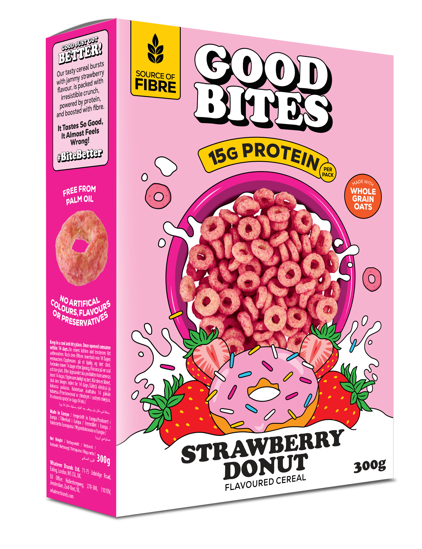Good Bites Strawberry Donut Cereal is a delicious and wholesome cereal made with whole grains, a source of protein and fibre, and bursting with natural strawberry flavour—perfect for a fruity and feel-good start to your day.